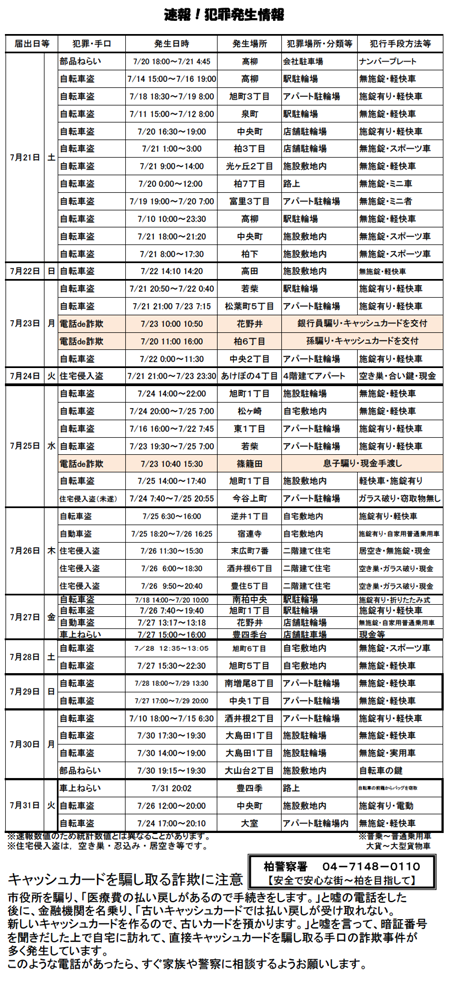 柏市防犯協会は、犯罪のない明るい社会をつくることを永遠の理想とし、社会環境の浄化を推進し、警察の防犯活動などに積極的に協力して、住民と警察による一体となった防犯活動の推進を図ることを目的としています。
